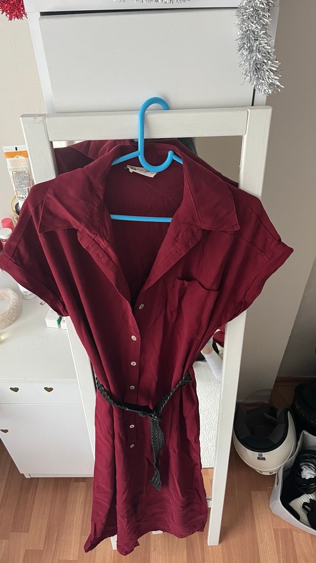 Bordo renk, kemerli ve kısa kollu, yakalı gömleği. Sentetik kumaştan, günlük rahat sokak stili için uygun.