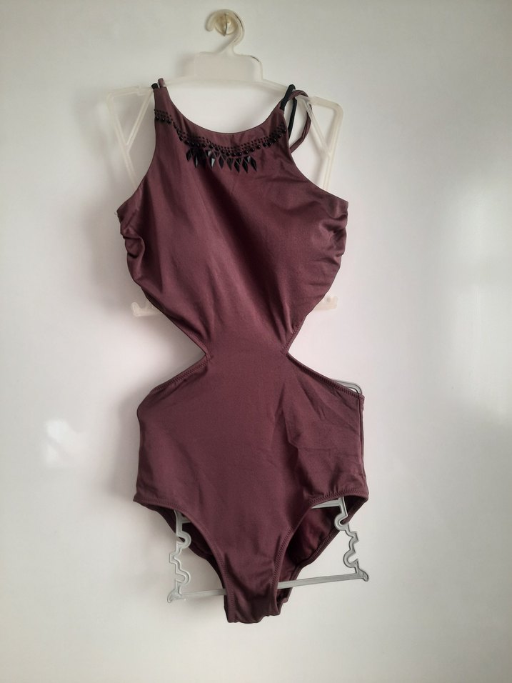 Bordo renkli, kemerli ve ince askılı, vücuda oturan midi uzunluğunda bir mayo. Cesur ve modern tarzıyla plajda dikkat çeker. ️