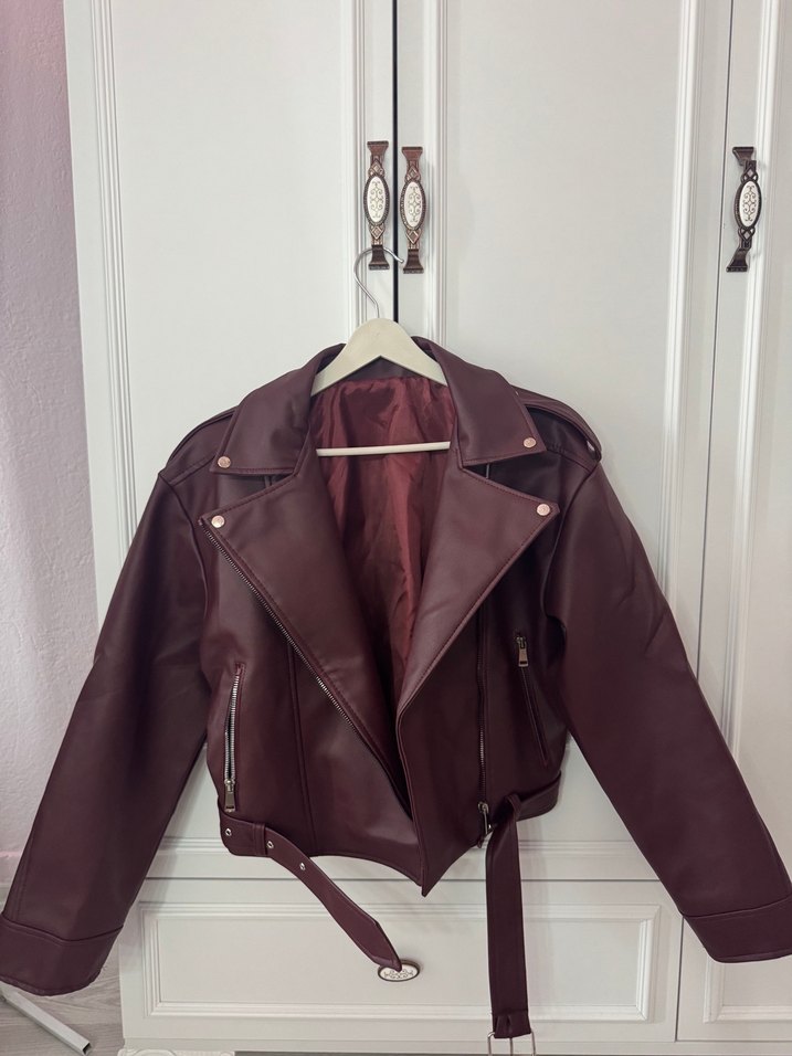 Bordo Kemerli Kadın Deri Ceket