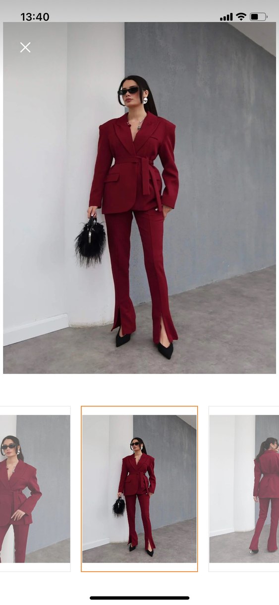 Bordo renkli kadın iş takımı, kemerli ve kesimli yakalıdır. Midi boy, regular fit ve askılı kollu bu takım, ofis için modern ve cesur bir görünüm sunar.