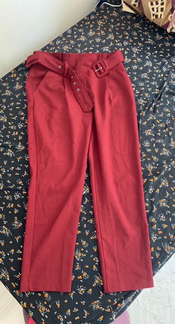 Bordo renkte, kemerli ve normal boyda kadın kumaş pantolon. Rahat kesimi ve sentetik dokusu günlük sokak stili için uygundur.