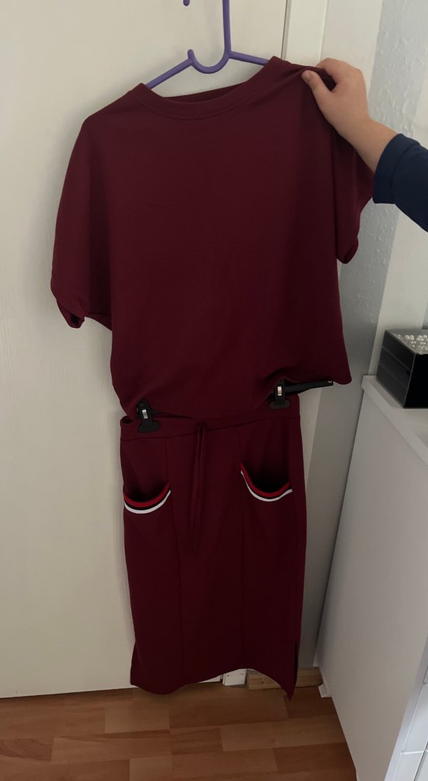 Kadınlar için bordo renkli, kemerli ve midi boyda, kısa kollu, yuvarlak yakalı bol kesim eşofman takımı. Günlük kullanıma uygun premium yumuşacık kumaşlı