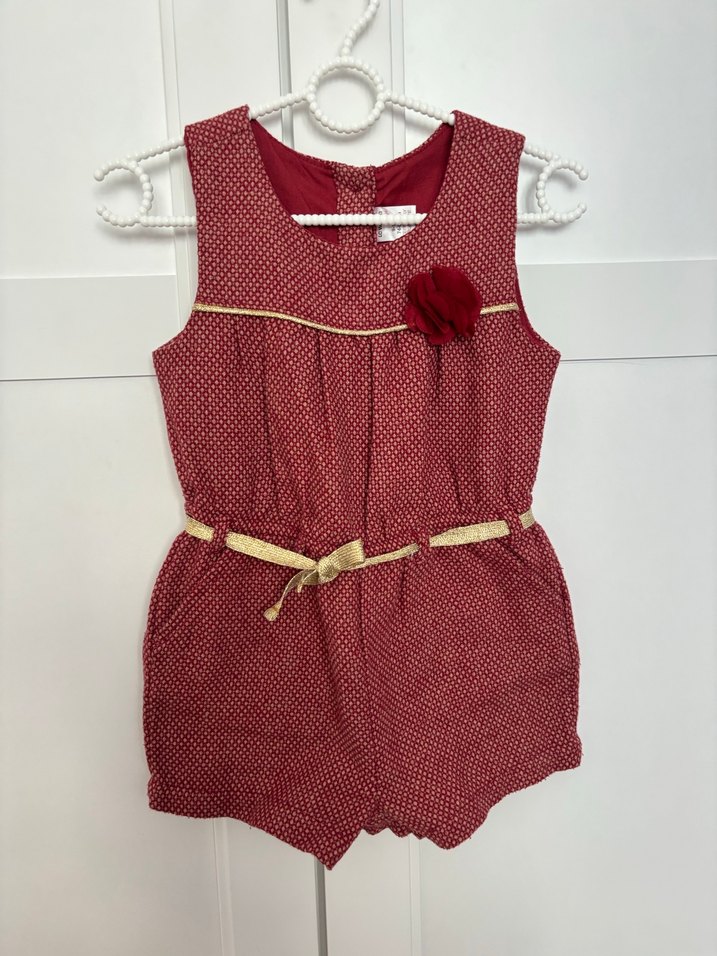 Bordo renkli, kemerli ve çiçek detaylı, bohem tarzda kız tulumu, kolsuz ve vücuda oturan kesimde.