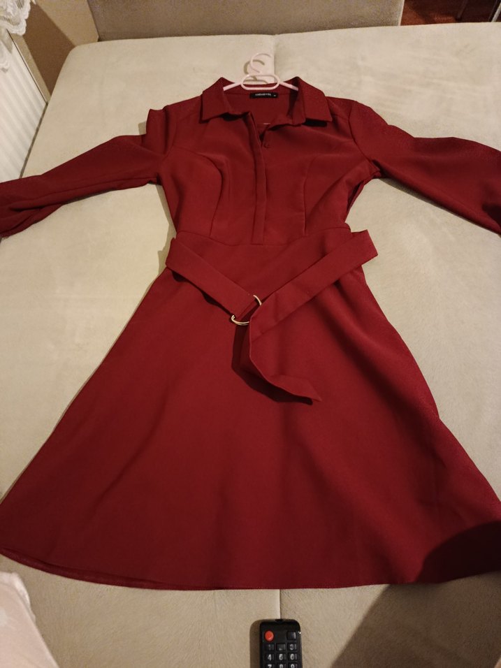Kemerli, bordo midi elbise, parlak sentetik kumaştan ve klasik kesimlidir. Uzun kollu, yakası kesik ve desensizdir.