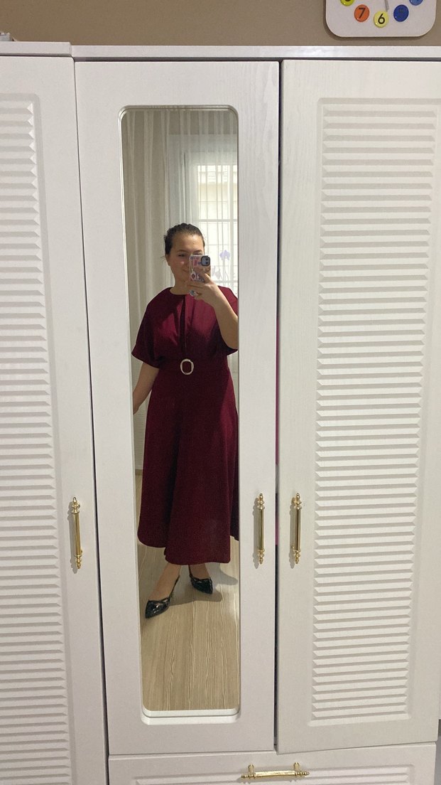 Bordo renkte, ve kısa kollu midi elbise. Kemerli ve bol kesim, ipeksi dokusuyla ofis için uygun. 1.58 boy 70 kilo