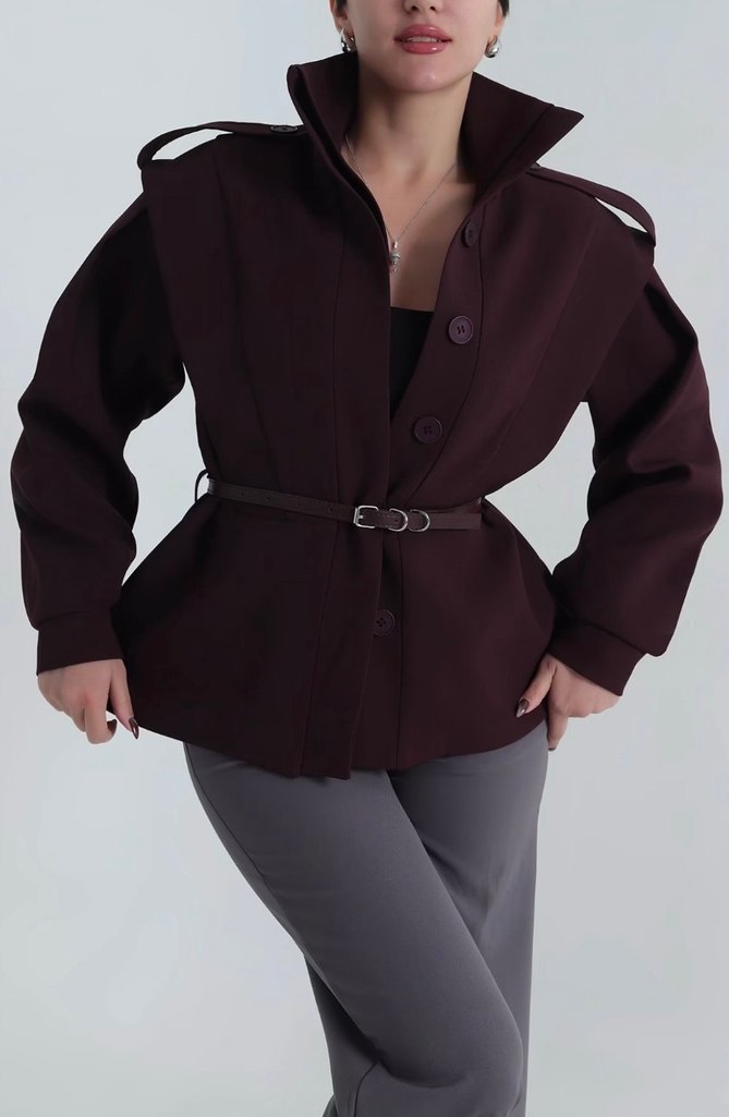Bordo renkli, kemerli ve kesik yaka detaylı kadın ceket. Uzun kollu, midi boyda ve rahat kesimdir. Ofis kullanımı için uygundur.