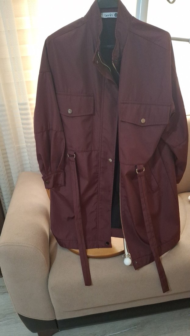 Bordo renk, uzun kollu, kemerli ve cepli bol kesim midi kadın ceket. Notlu yaka detayıyla sokak stiline uygun.