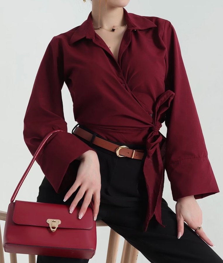 Bordo renkli, kemerli ve V yakalı kadın gömlek, deri dokusuyla ofis kullanımı için uygun, midi boy ve oturan kesimdir.