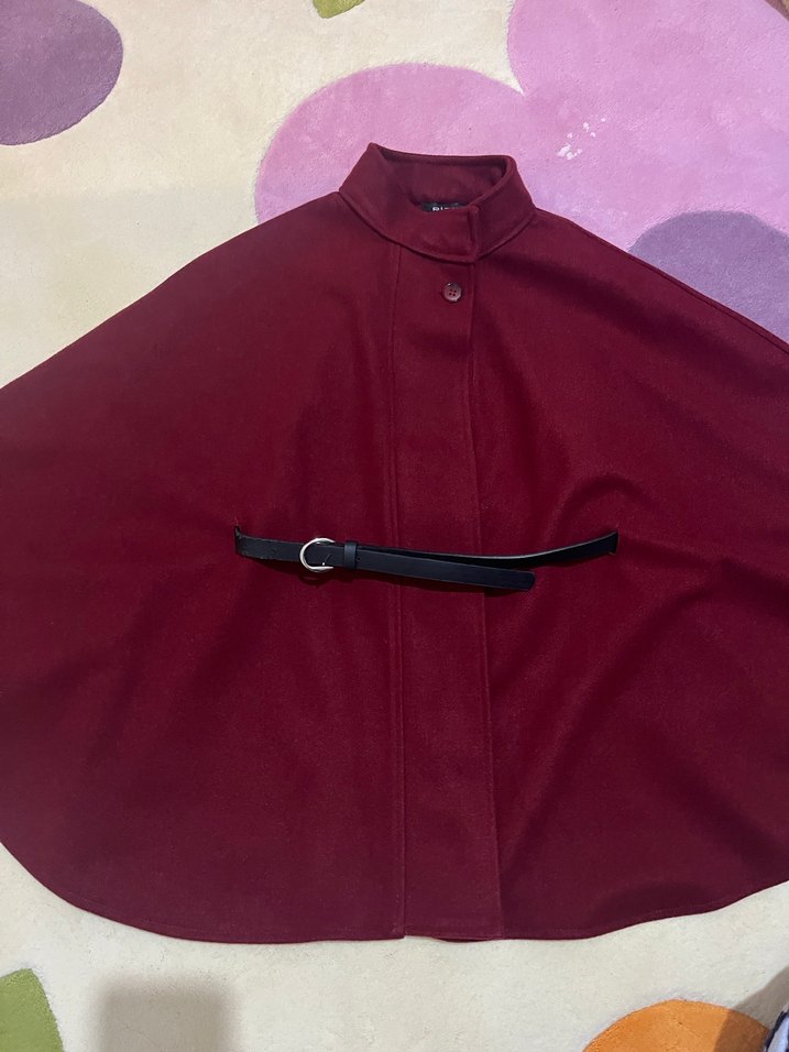 Standart bedendir. Bordo renkli kadın panço, yüksek yakalı ve kemerli tasarıma sahiptir. Yumuşak kumaştan yapılmış, bol kesim ve askılı kol detaylarıyla gündelik kullanıma uygundur.