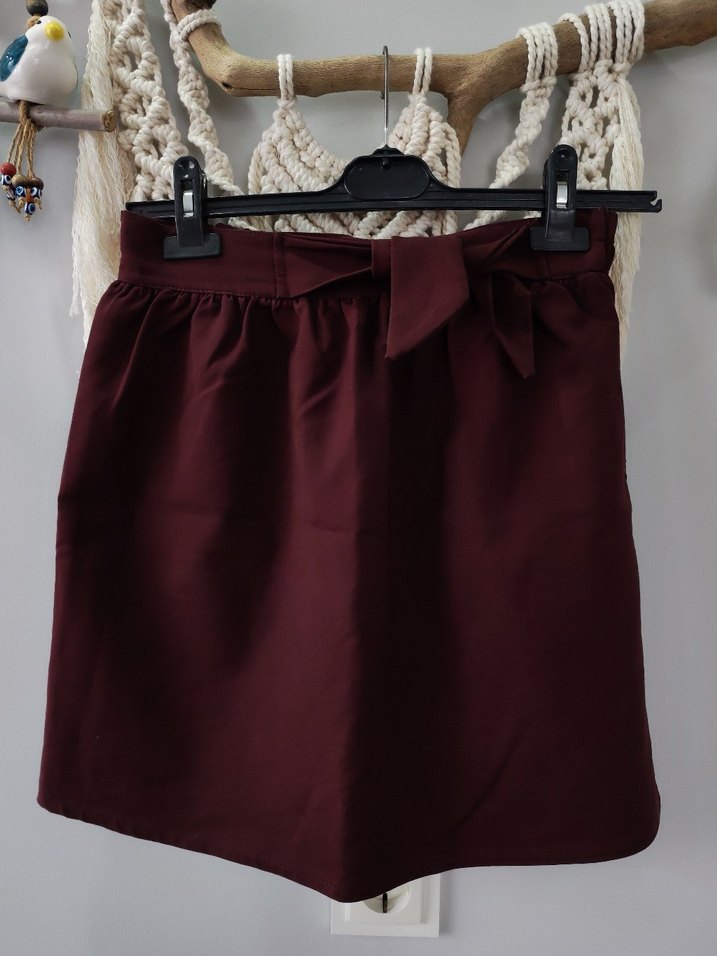 Bordo renkli, kemerli ve bol kesim mini etek. Sentetik kumaştan yapılmış, desensiz ve bohem tarzda günlük kullanıma uygun.
