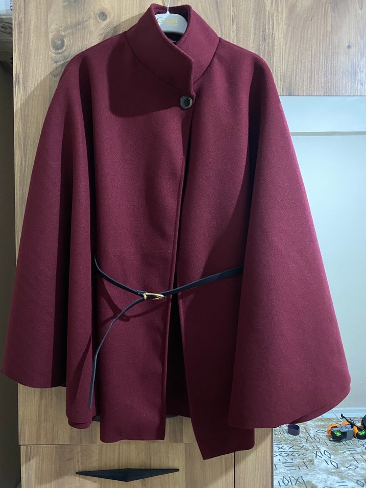 Bordo renkli, kemerli, notlu yaka ve uzun kollu kadın panço. Gevşek kesim ve yumuşak, sıcak kumaştan. Ofis için uygun klasik ve rahat stil sunar. ETİKETLİ HİÇ KULLANILMADI