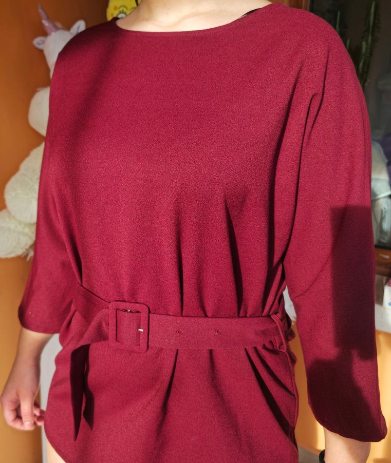 Bordo renkli bluz, bisiklet yakalı ve kemerli bel detayıyla rahat bir kesime sahiptir.