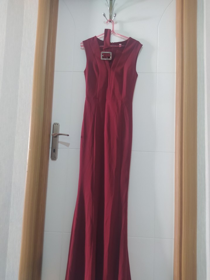 Bordo renk, kemerli, uzun ve kolsuz abiye elbise. V yaka, parlak ve desensiz kumaş, düzenli kesim, düğün için uygun.beden 38.ama 36beden uyumlu.dar kesim
