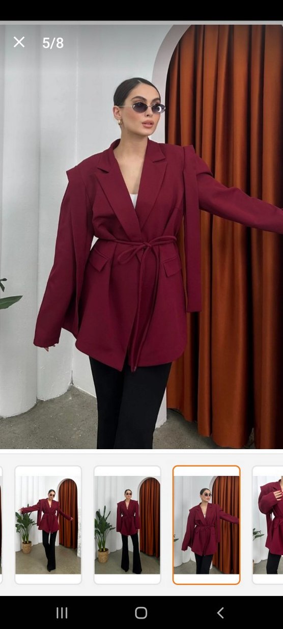 Bordo renkli, kemerli ve uzun kesim kadın blazer ceket. Notlu yakalı ve uzun kolludur, ofis ve günlük kullanıma uygundur.