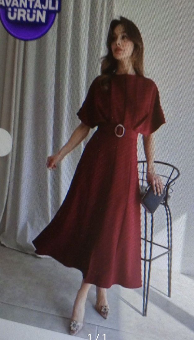 Bordo renkli, kemerli ve bol kesim uzun elbise, ipeksi kumaş ve ince askılı yaka detaylarıyla klasik ve çağdaş tarzı birleştirir.