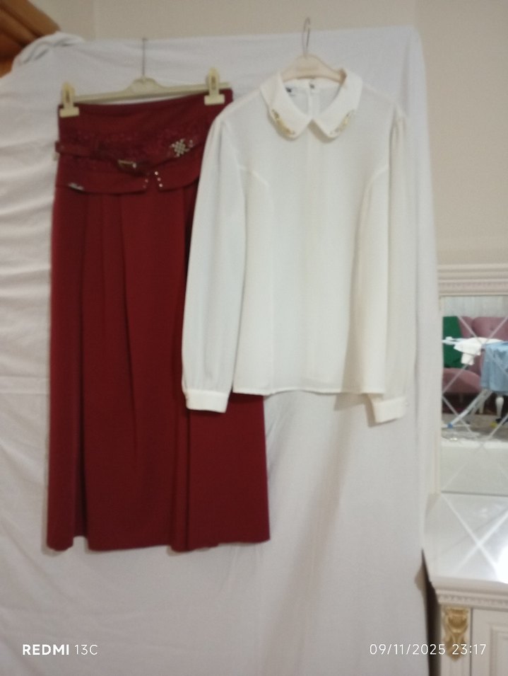 Bordo Kemerli Uzun Kadın Etek ve gömlek