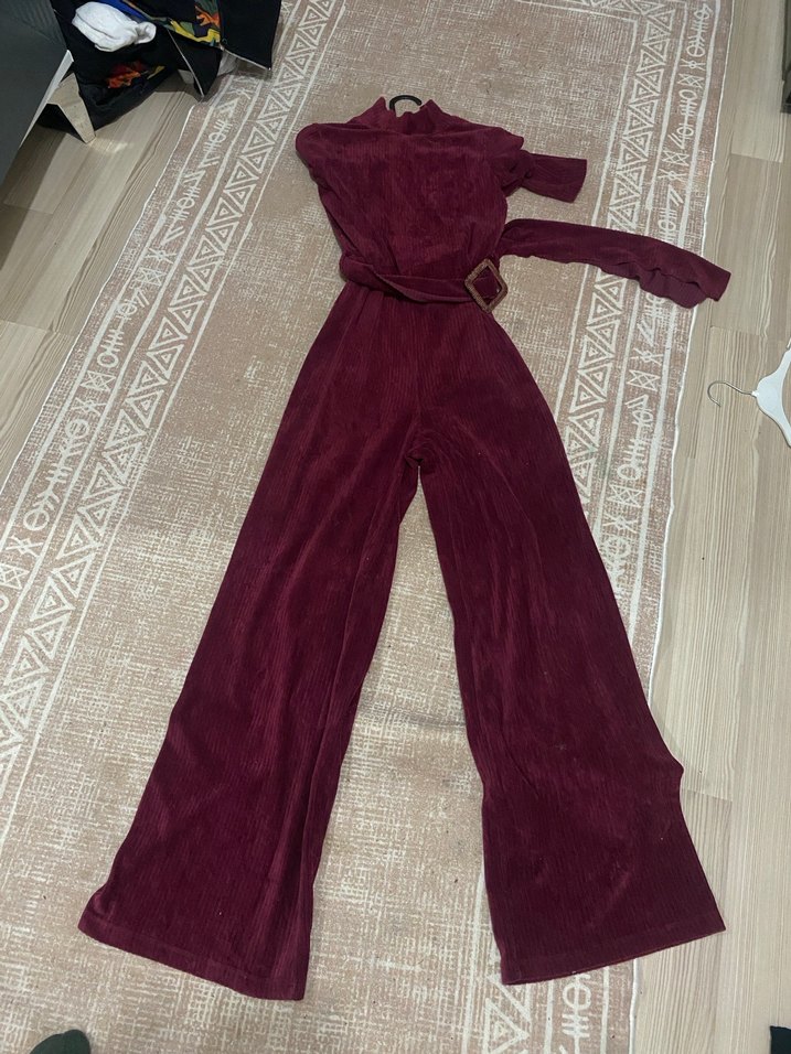 Üzerindeki beyaz noktalar leke değil toz Bordo renkli bu uzun tulum, kemerli ve strappy kollu dar kesime sahiptir. Yumuşak sentetik kumaştan yapılmış, V yakalı ve desensizdir, günlük kullanım için uygundur.