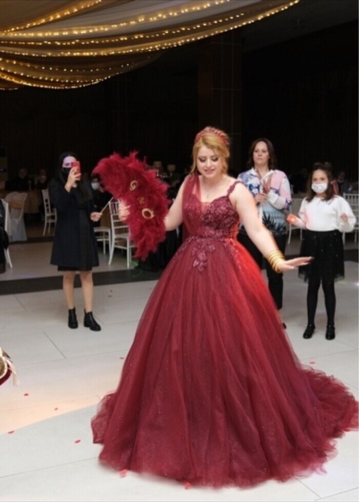 Bordo kendinden simli ve astarlı tarlatanlı kına tuvaleti sadece 2 saat giyildi. Çok rahat arkası bedene göre ayarlanabilir. Van içi elden teslim alabilir.