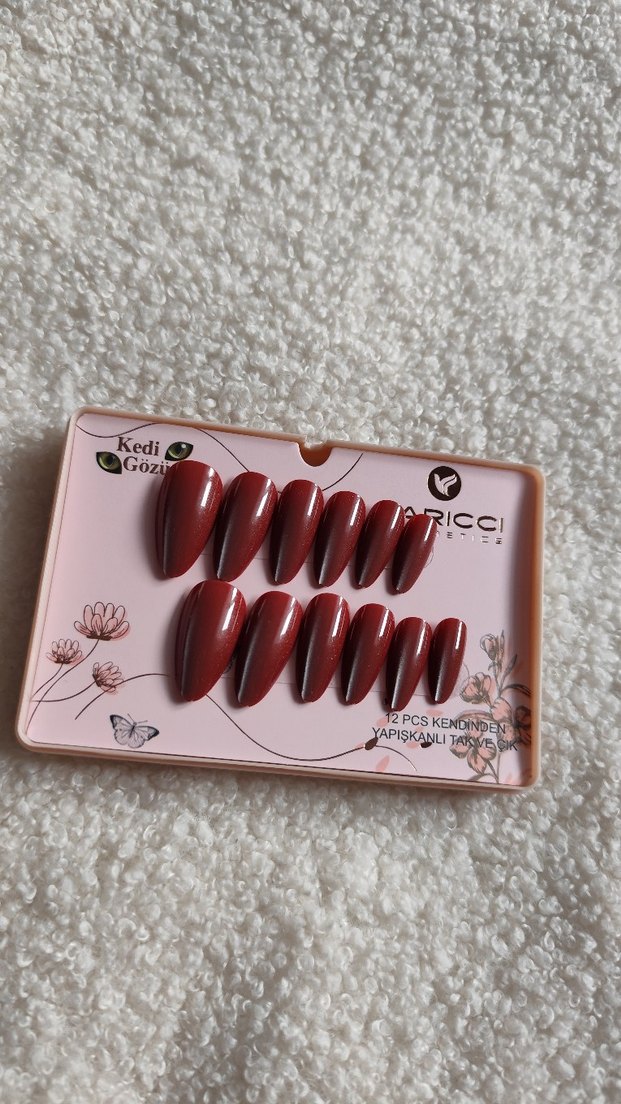 Kedi gözü desenli, bordo renk kendinden yapışkanlı 12 parça tırnak süsü. İçinde 12 adette tırnak yapıştırıcısı bulunmaktadır. Size çok yakışacağına eminim ✨ Hiç kullanılmamış sıfır üründür ✨