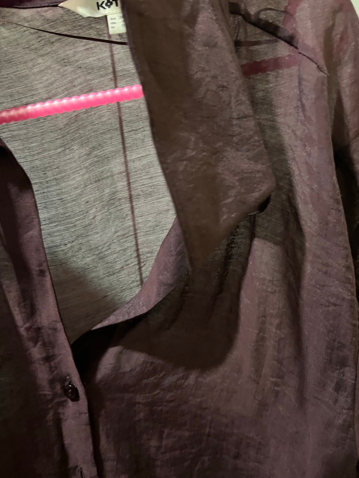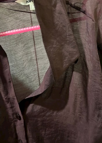 Bordo renkte, keten kumaştan, uzun kollu ve düğmeli, kesim olarak bol ve normal uzunlukta kadın gömleği. Modern ve desen içermeyen tasarımıyla günlük kullanıma uygun.