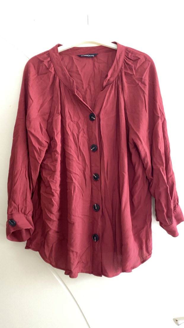 Bordo renkli keten gömlek, düğmeli ve uzun kolludur. Salaş kesimi ve kesik yakası ile günlük kullanıma uygundur.