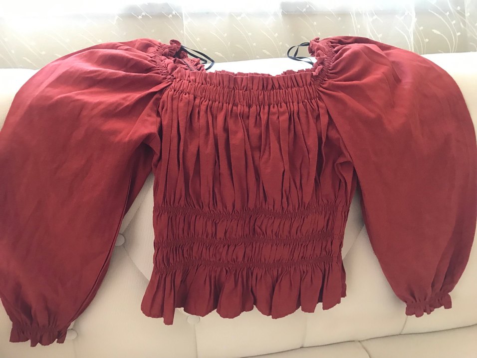 Bordo keten kumaştan, uzun kollu, tek renk, fırfırlı ve bohem tarzda, normal midi boyda, dar kesim kadın bluz.