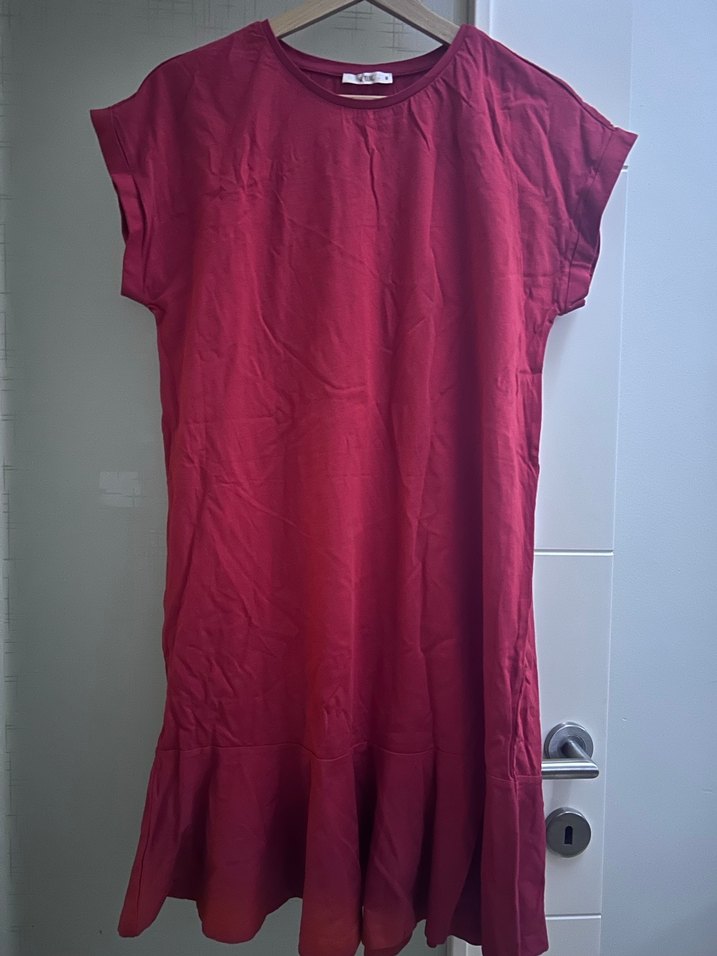 Bordo renk keten kumaştan, kısa kollu, yuvarlak yakalı, bol kesim midi elbise. Rahat sokak stili için drapeli etek ucu bulunur. Boy 90