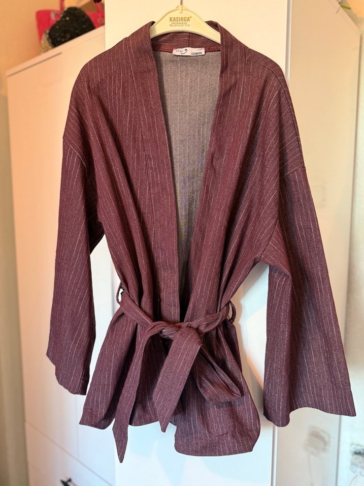 Bordo keten kumaştan, drapeli, bol kesim, yakası kesik ve uzun kollu midi kimono. Kuşaklı, rahat ve bohem tarzda, günlük kullanım için uygun.