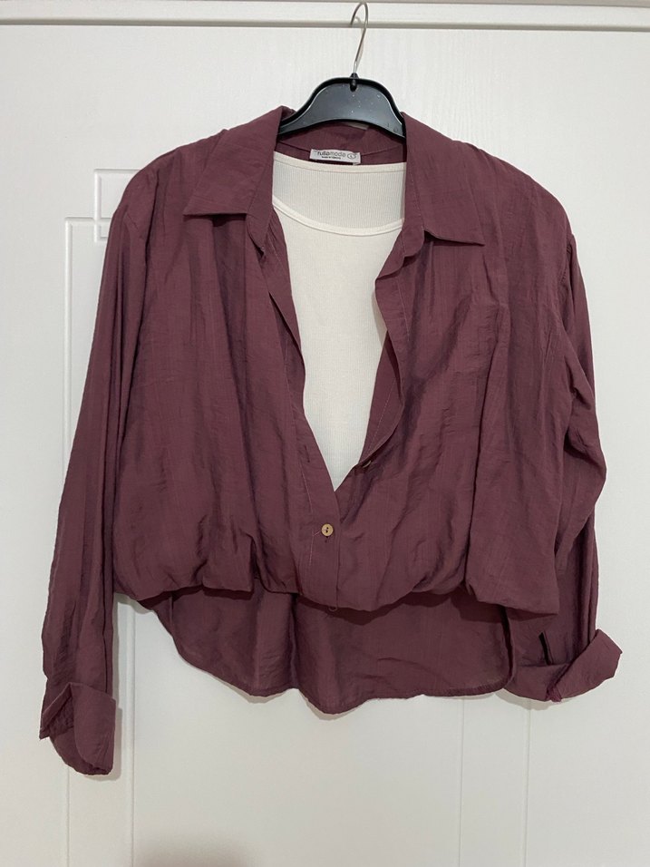 salaş kesim, yakalı ve uzun kollu, düğmeli, kendinden beyaz croplu minimalist tarzda kadın gömlek.