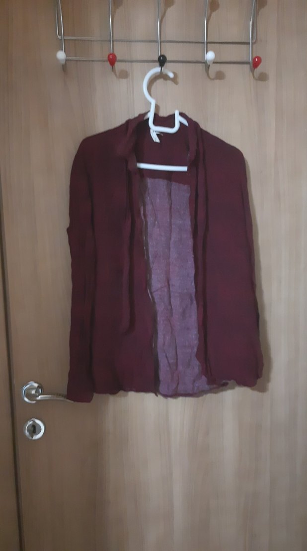 Bordo renk keten kumaştan, uzun kollu, salaş kesim ve yakalı midi uzunlukta, drapeli rahat bir gömlek. Günlük kullanıma uygundur.