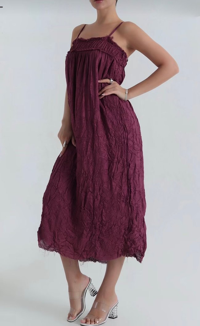 Bordo renkli keten kumaştan yapılmış, uzun ve salaş kesim askılı elbisedir. Dökümlü tasarımıyla bohem tarzı yansıtır. Kolsuz ve desensizdir, günlük ve özel gün kullanıma uygundur. Marka TEMSİLİ