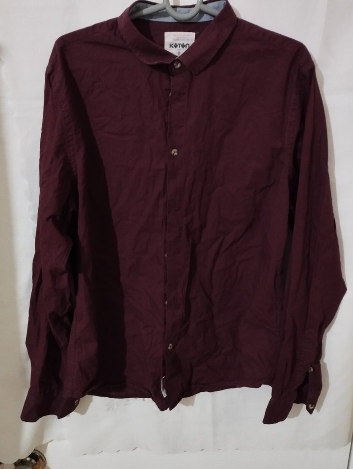 Bordo keten kumaştan, uzun kollu, düğmeli ve yakalı erkek gömlek. Normal boyda ve regular fit kesime sahiptir, günlük sokak tarzına uygundur.