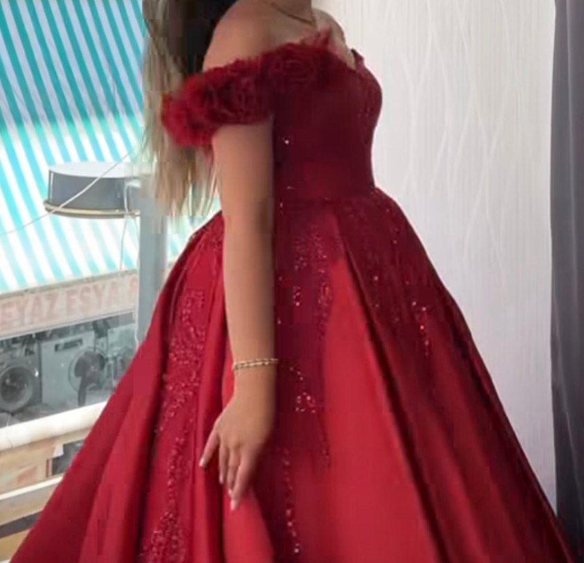 Bordo saten dantel detaylı omuz hareketlı kabarık abıye