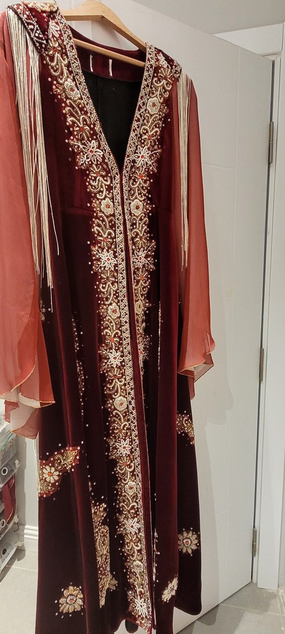 Bordo renkli, uzun kollu ve dökümlü kaftan. Kemeri ve tacı da var.