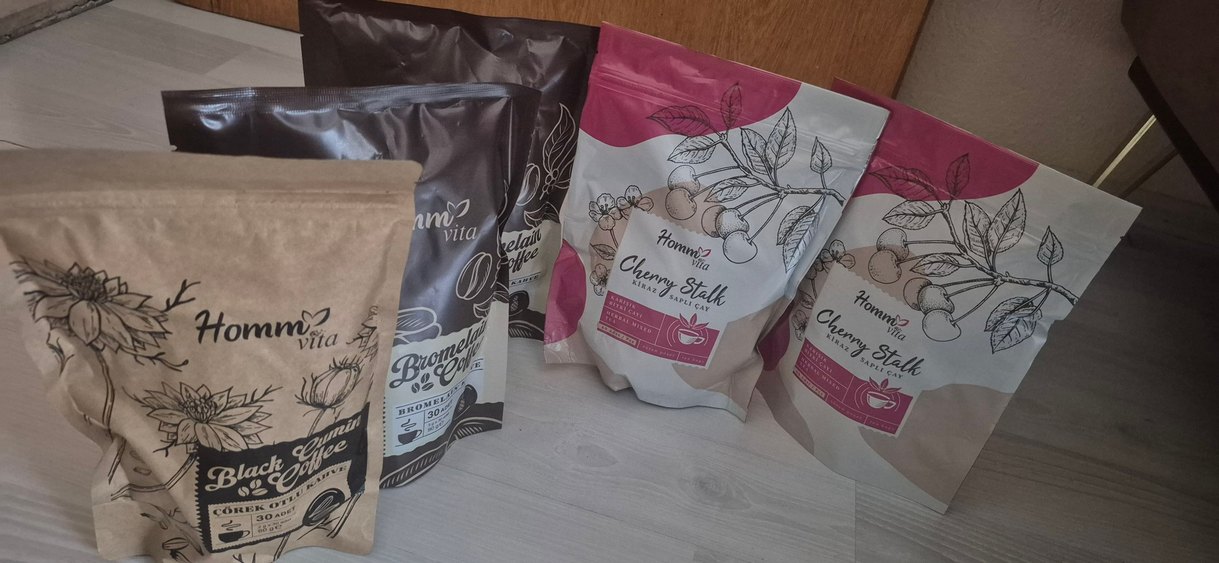 Homm Vita markasına ait bordo kiraz çubuklu çay ve kahve karışımlarını içeren pastel renkli paketler seti.