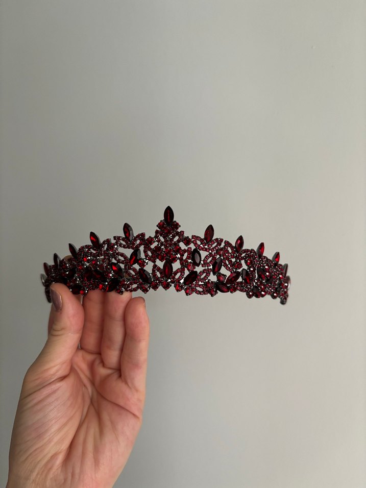 Bordo renginde, cam taşlarla süslenmiş, gotik tarzda parıltılı saç aksesuarı. Avant-garde ve modaya uygun bir seçim.