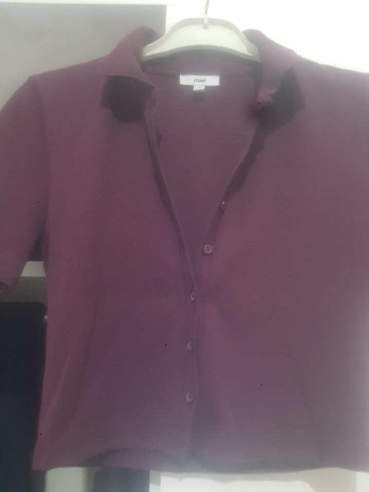 Düğmeli önü, kısa kollu ve yakalı, yumuşak süet kumaştan yapılmış bordo renkli, dar kesim kadın gömleği. Ofis kullanımı için uygundur.