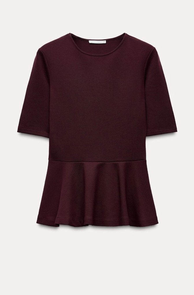 Bordo renk, kısa kollu, yuvarlak yakalı ve bol kesim olan bu bluz, etek kısmında fırfır detayıyla sade bir şıklık sunar.