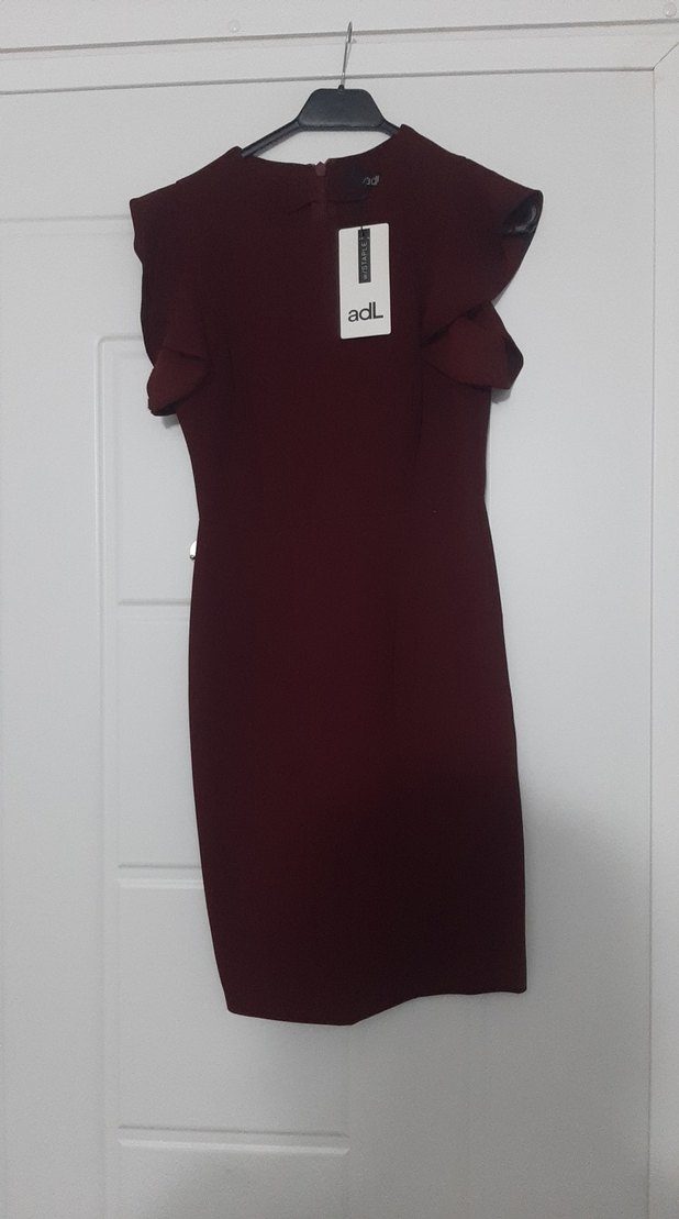 Bordo renkli, kısa kollu ve fırfırlı detaylı kadın elbise Yuvarlak yakalı, sentetik kumaştan, günlük kullanıma uygun sade tasarım.