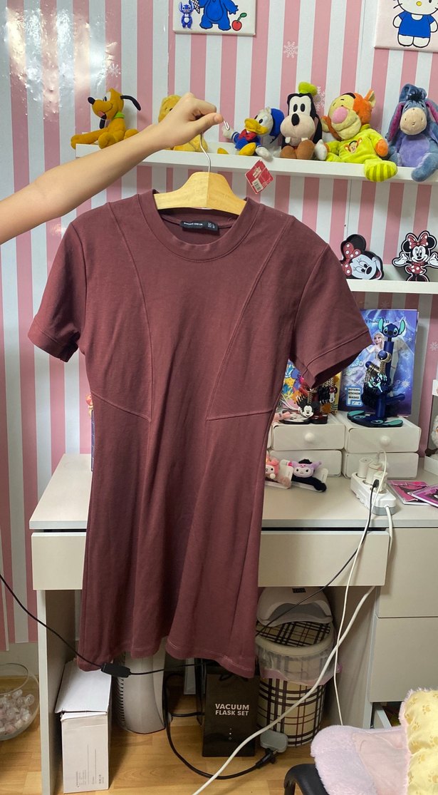 Bordo renkli, kısa kollu ve bisiklet yaka kesime sahip, rahat sentetik kumaştan yapılmış, günlük kullanım için uygun fitted hamile elbisesi.