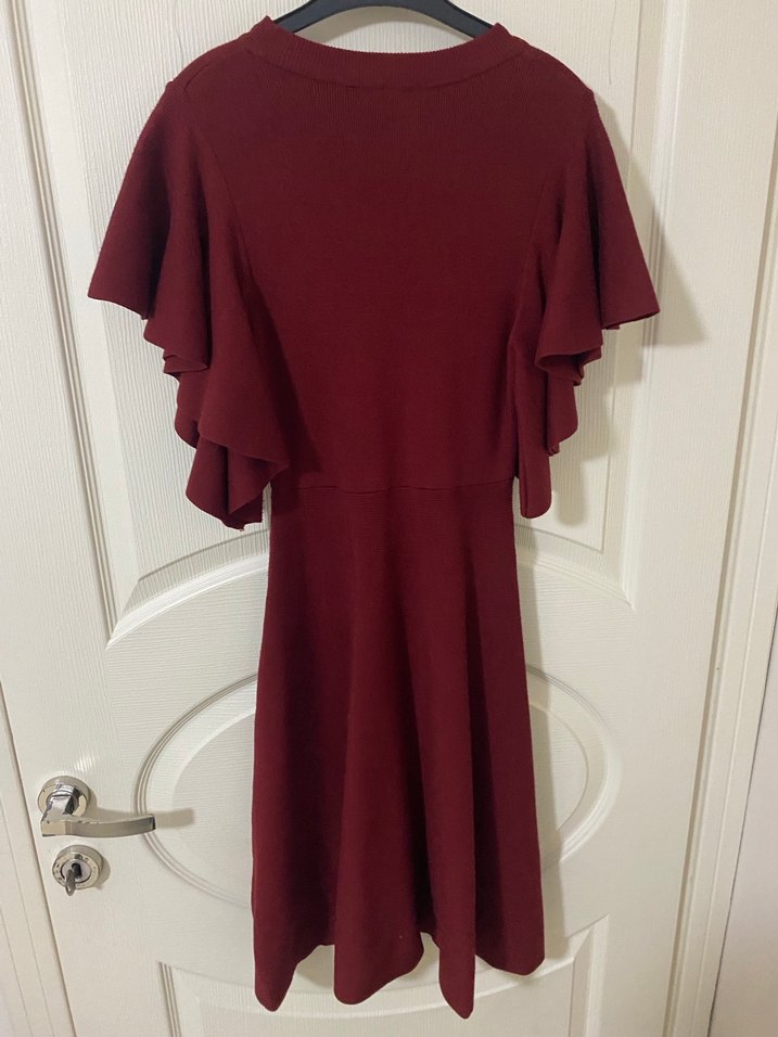 Bordo midi elbise, kısa volan kollu ve V yakalıdır. Minimalist ve modern klasik tarzıyla romantik akşamlar için uygundur.