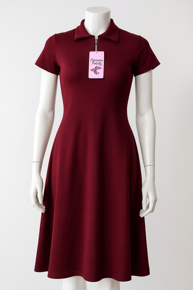 Bordo renk, kısa kollu, yakalı, fitted kesim midi elbise. Yumuşak ve sıcak kumaştan, hafif desenli, romantik akşamlar için uygun.