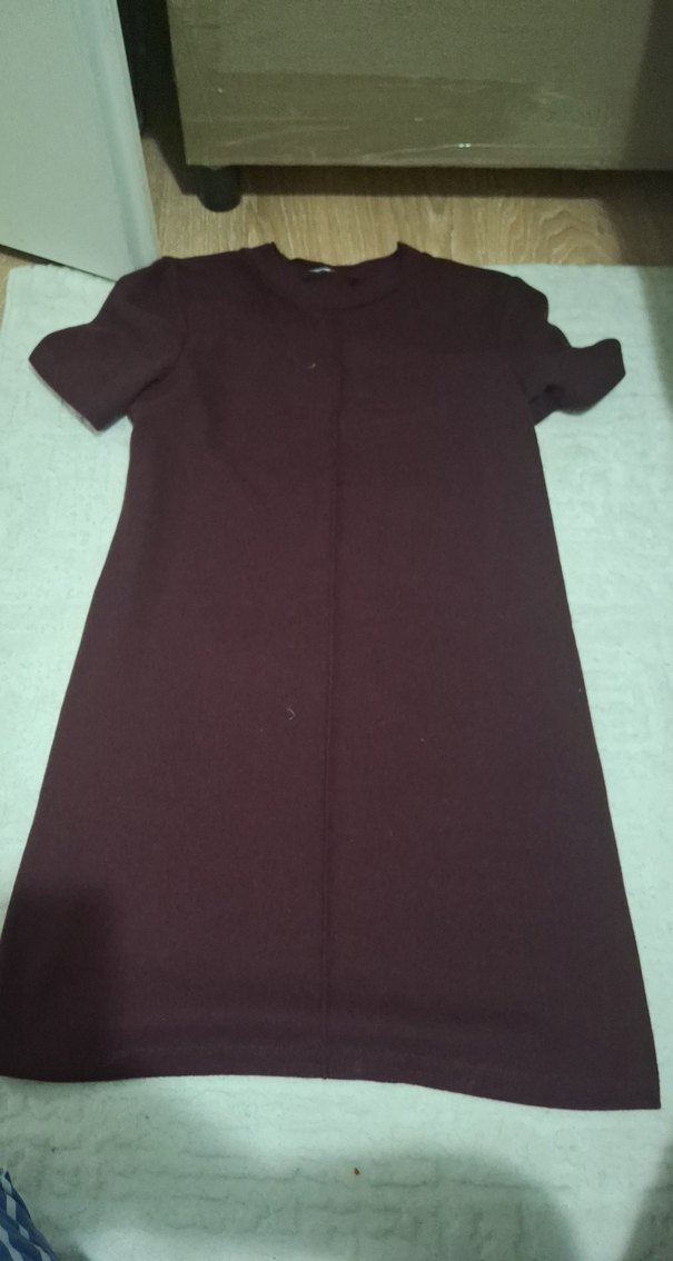 Bordo renkli, kısa kollu, bisiklet yaka midi elbise, yumuşak ve sıcak kumaştan, dar kesim ve minimalist tarzda sokak modasına uygun. dilvin