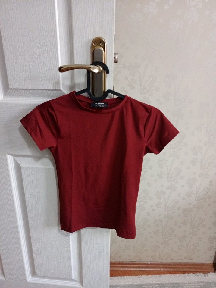 Bordo kısa kollu, dar kesim ve kısa boyda tişört. Günlük kullanım için yumuşak sentetik kumaştan üretilmiş, rahat ve şık bir görünüm sunar.