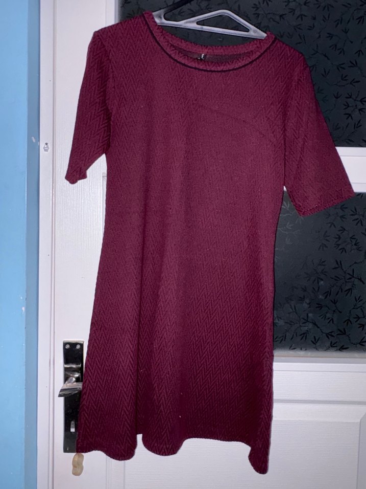 Bordo renkli, kısa kollu, yuvarlak yakalı ve örme dokulu midi elbise, yumuşak sentetik kumaştan günlük kullanım için uygundur. Defosu yok temiz sayılı kez kullandım M ve L bedene uygun . BOYU 80cm