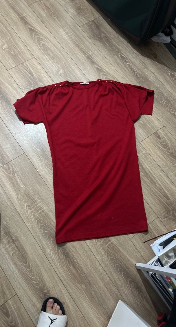 Bordo renkli, kısa kollu, yuvarlak yakalı ve salaş kesimli hamile elbisesi. Parlak sentetik kumaştan yapılmış, günlük rahat kullanım için uygundur.