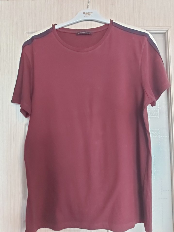 Bordo renk, kısa kollu, yuvarlak yakalı ve salaş kesim tişört. Omuzlarda şerit detayları bulunan, sokak stiline uygun rahat penye kumaş tişört. genişlik 55 santim boyu 70 santim