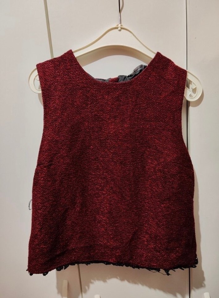Bordo renkli, kısa ve örgü dokulu, kolsuz kadın süveter. Yuvarlak yaka ve bol kesim, günlük kullanıma uygun rahat ve şık bir model. 1 kere giydim Marka temsilidir