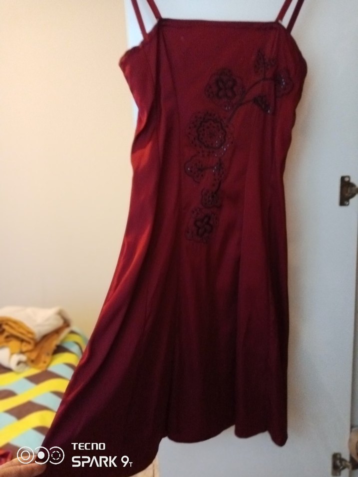 Bordo renk, saten ve straplez yakalı, kısa ve vücuda oturan elbisedir. Romantik akşamlar için uygundur.