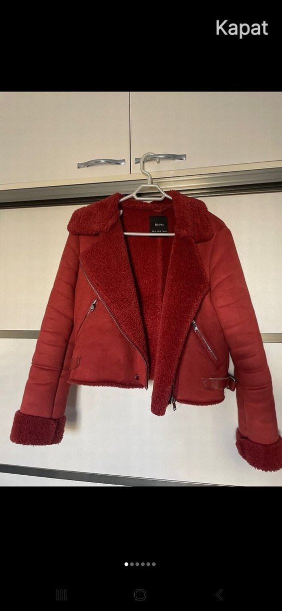 Bordo renkte, süet kumaştan yapılmış, kürklü yaka ve manşetlere sahip dar kesim kısa ceket. Notlu yaka ve uzun kolludur, rahat sokak stiline uygundur.